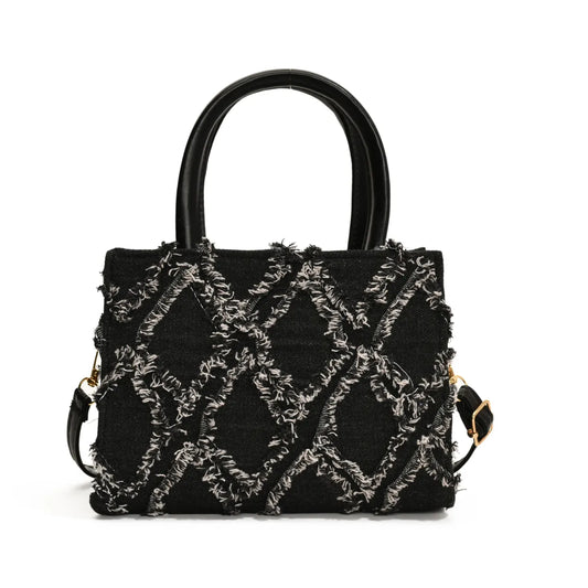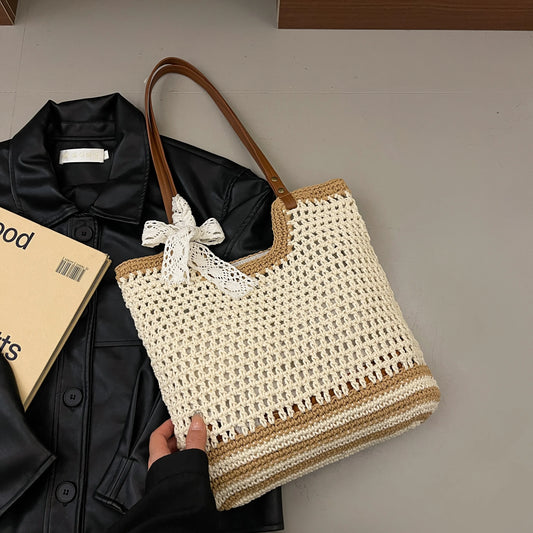 Contrast Woven Straw Beach Tote Bag with Tassel Detail