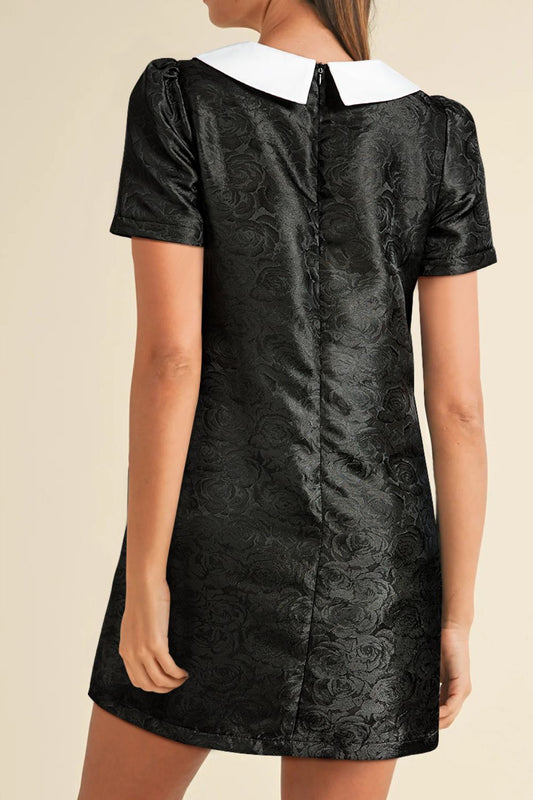 Floral Embossed Puff Sleeve Colorblock Bow Collared Mini Dress