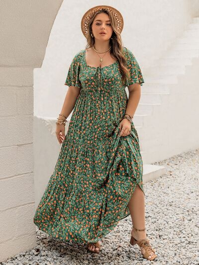 Plus Size Printed Short Sleeve Slit Tiered Maxi Dress