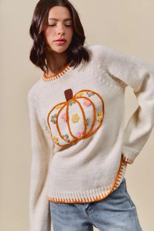 SO ME Pumpkin Floral Embroidered Thanksgiving Sweater