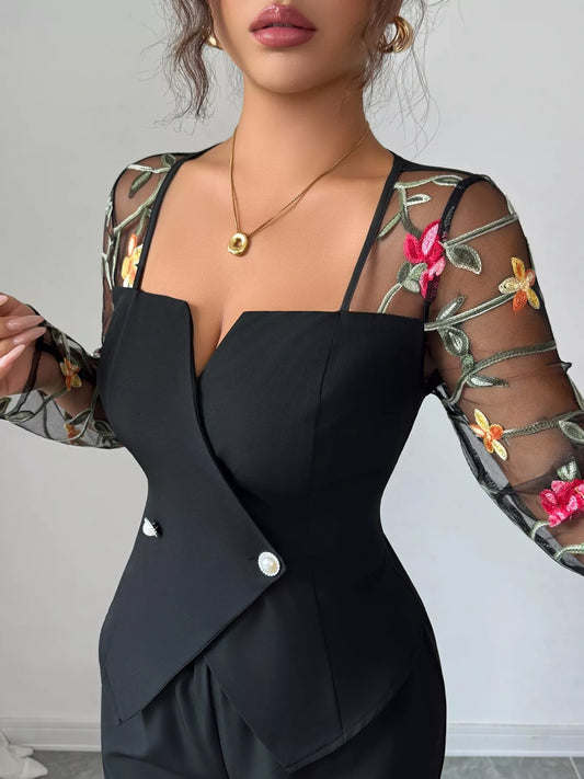Floral Embroidered Sleeve Top and Pants Set