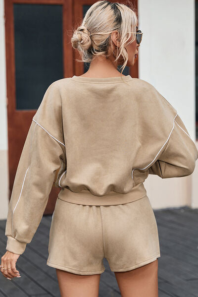 Round Neck Long Sleeve Top and Drawstring Shorts Lounge Set