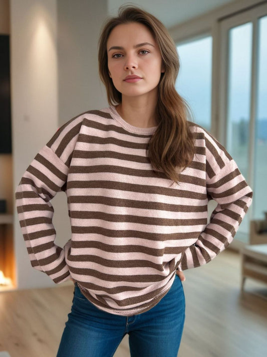 Striped Detail Round Neck Dropped Shoulder Sweater