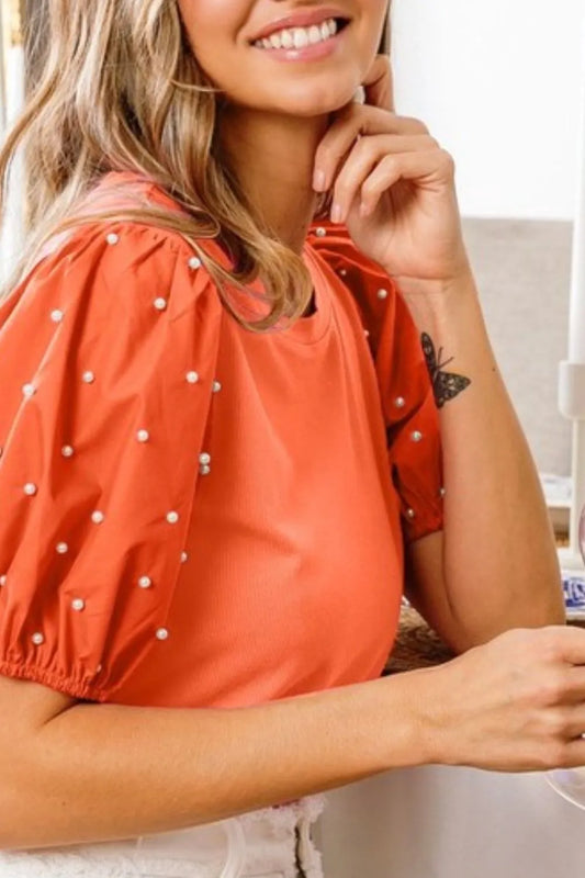 BiBi Pearl Beaded Short Puff Sleeve Top