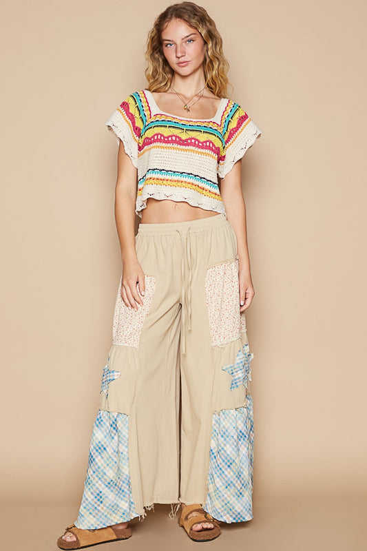 POL Openwork Ethnic Pattern Square Neck Cropped Knit Top