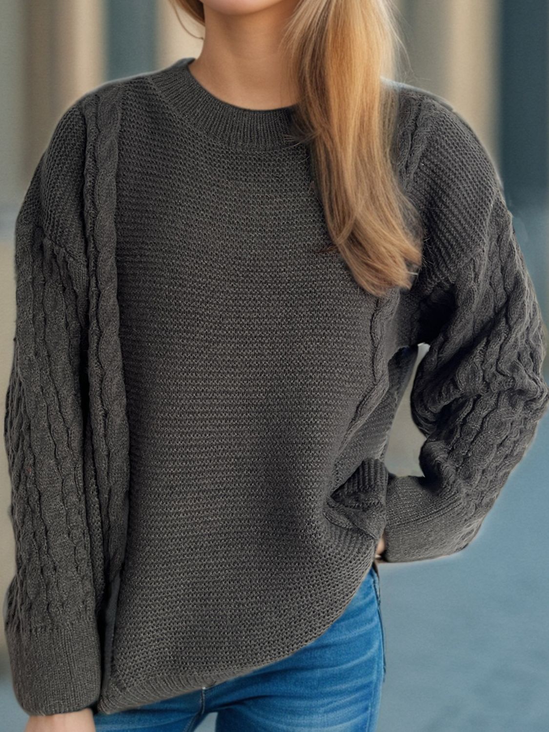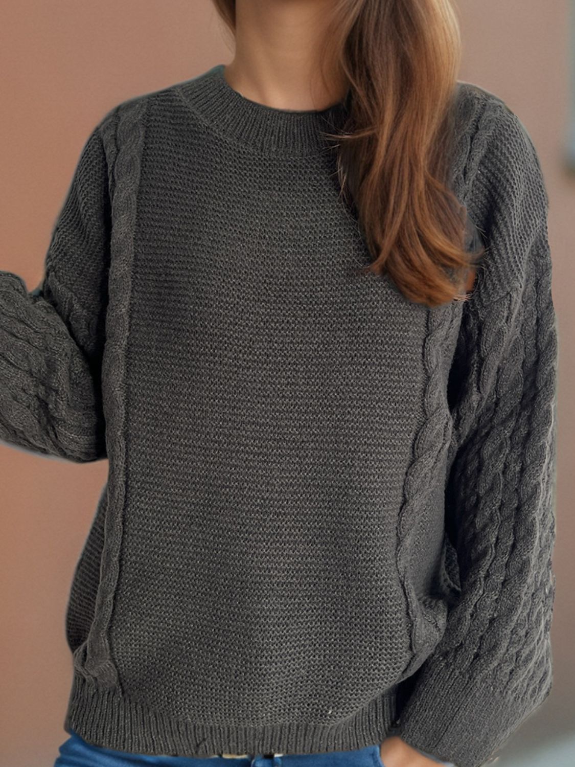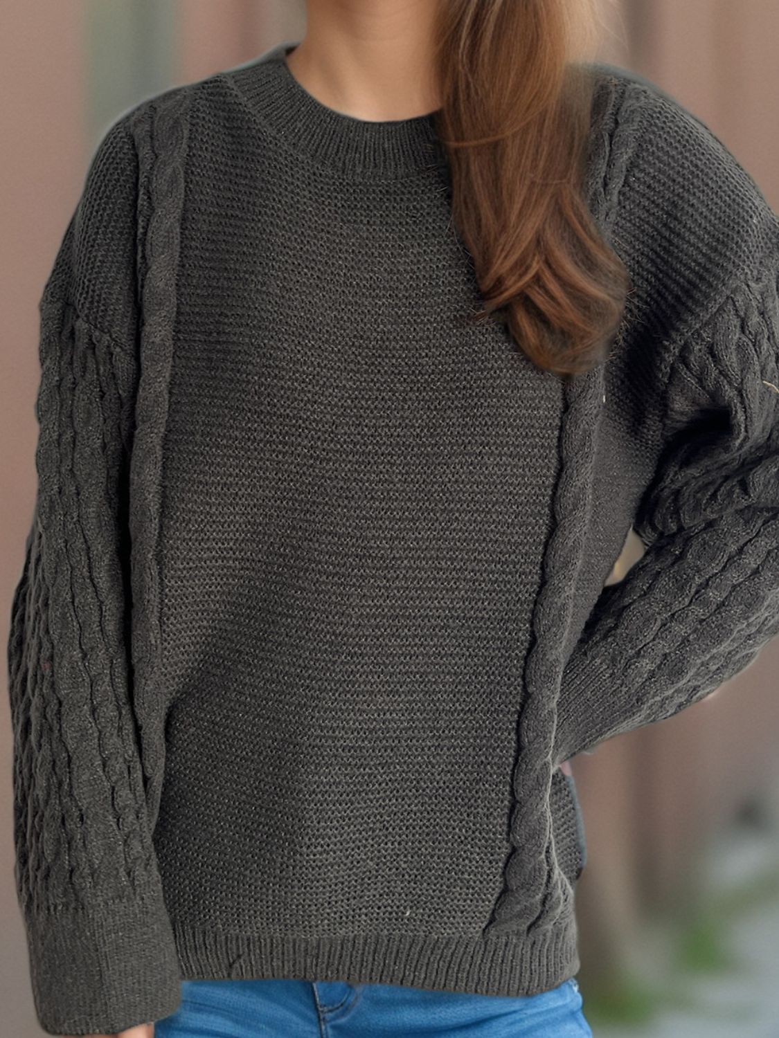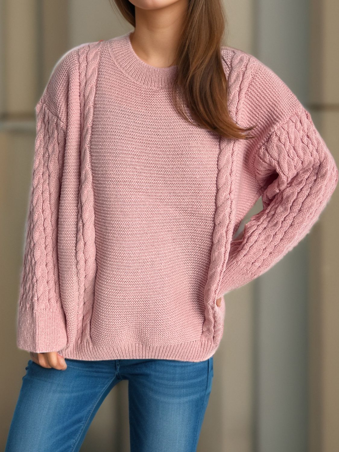 Cable-Knit Round Neck Long Sleeve Sweater
