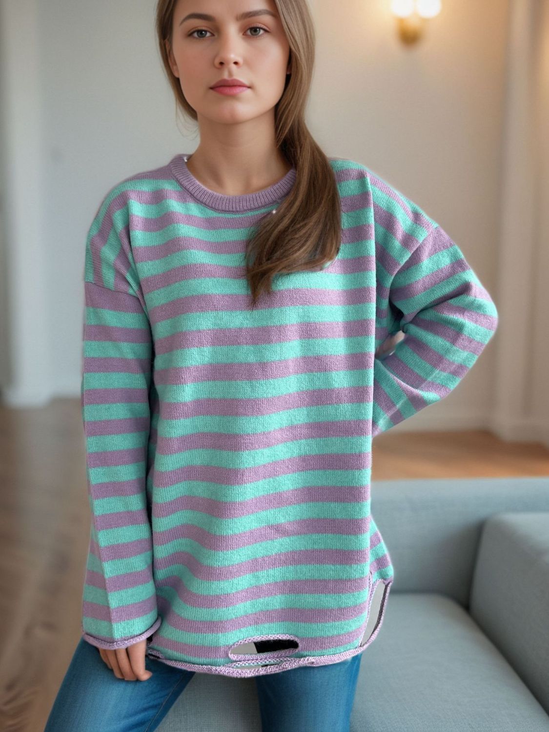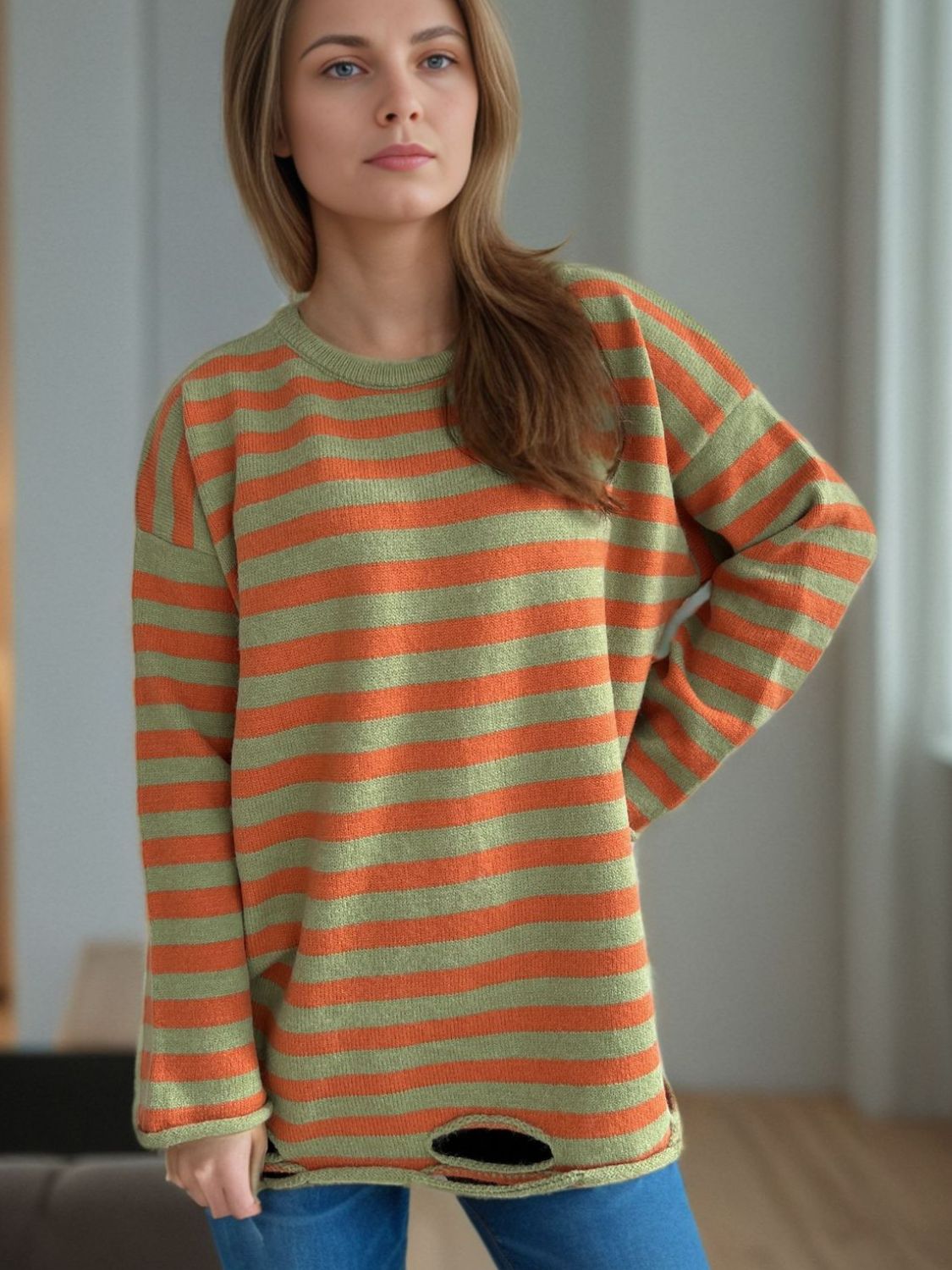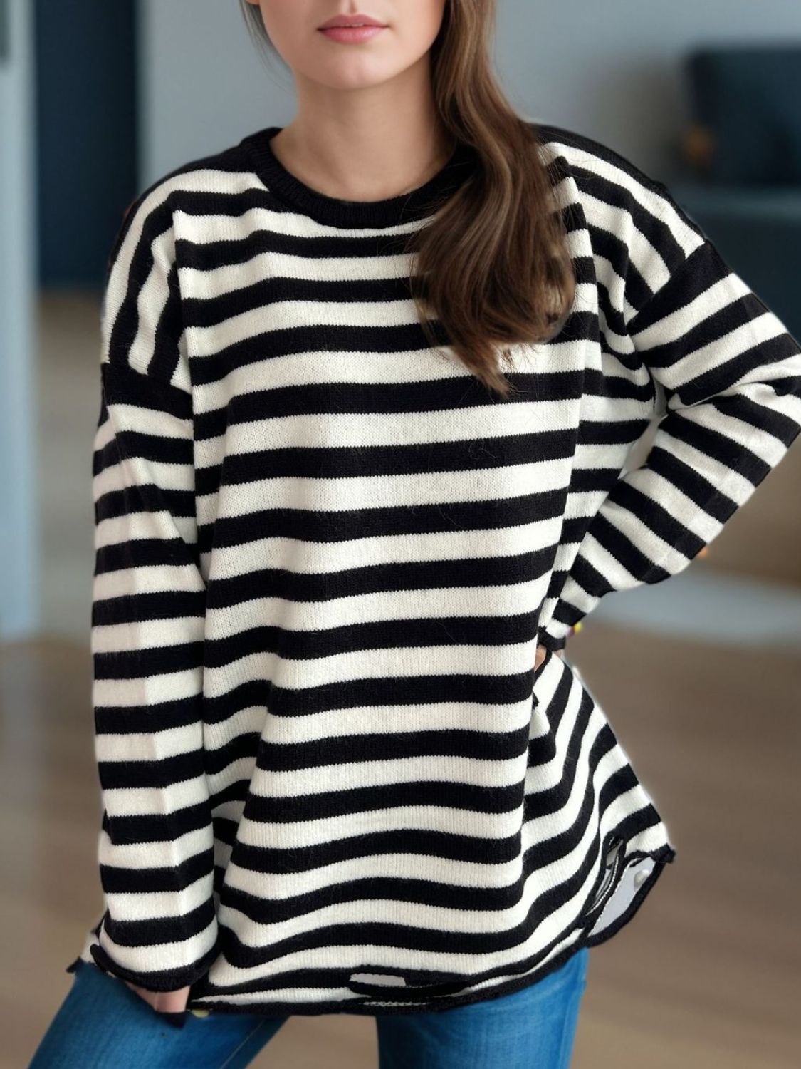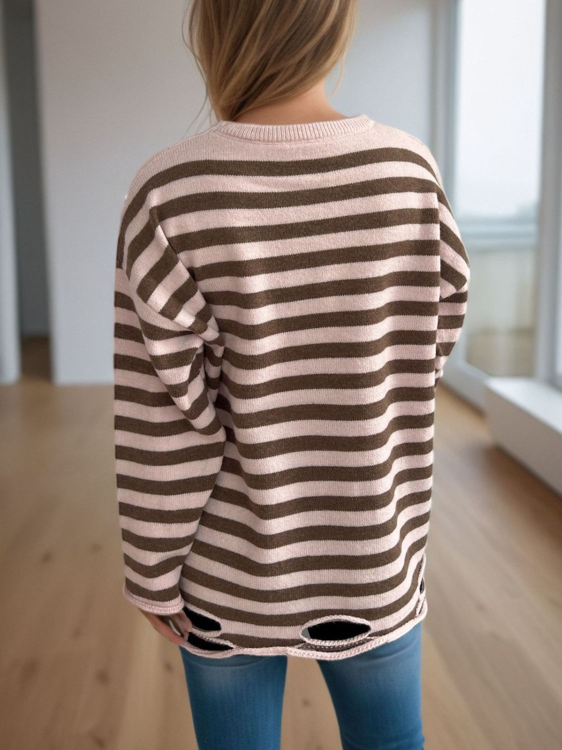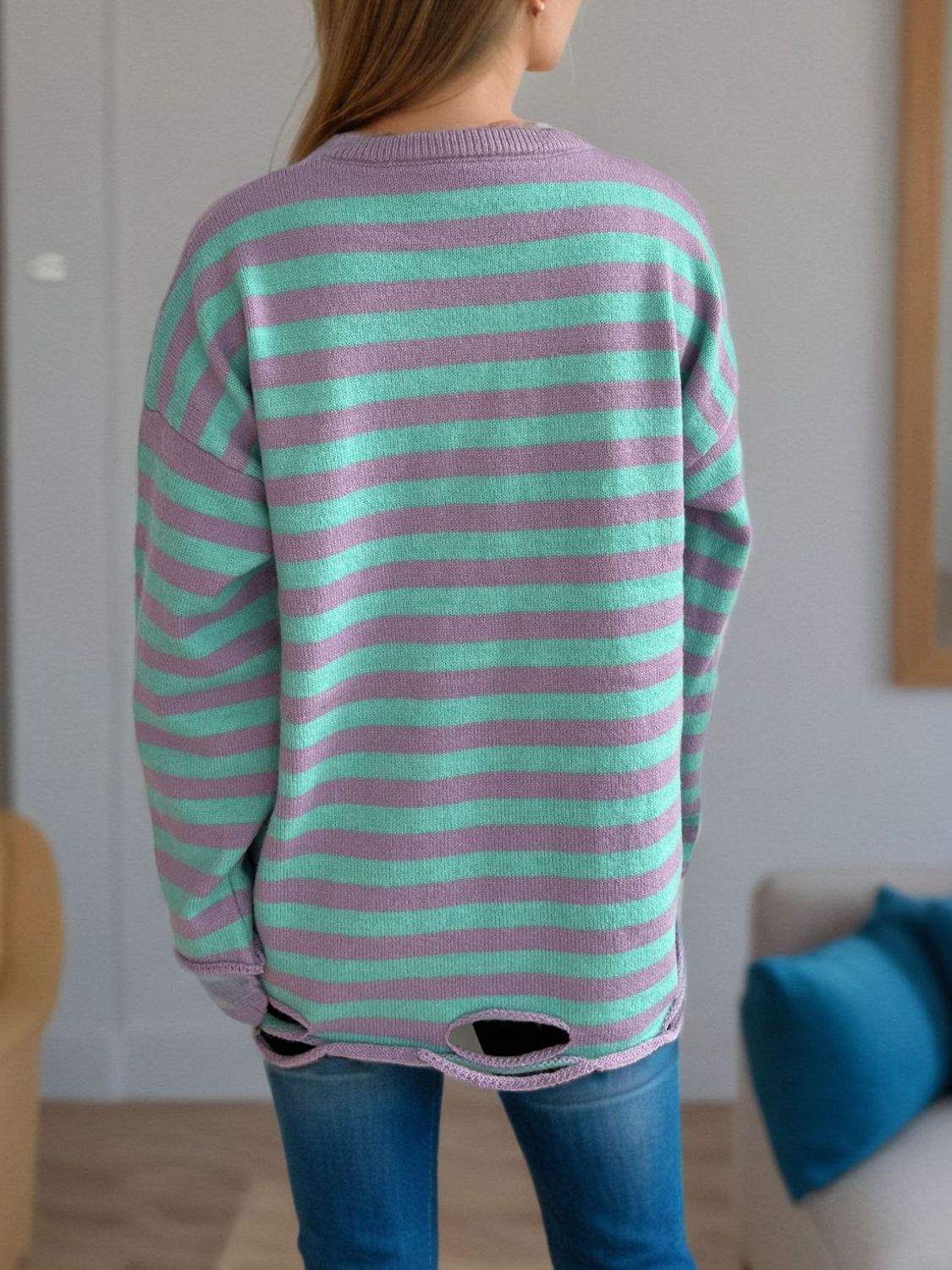 Distressed Striped Round Neck Long Sleeve Sweater