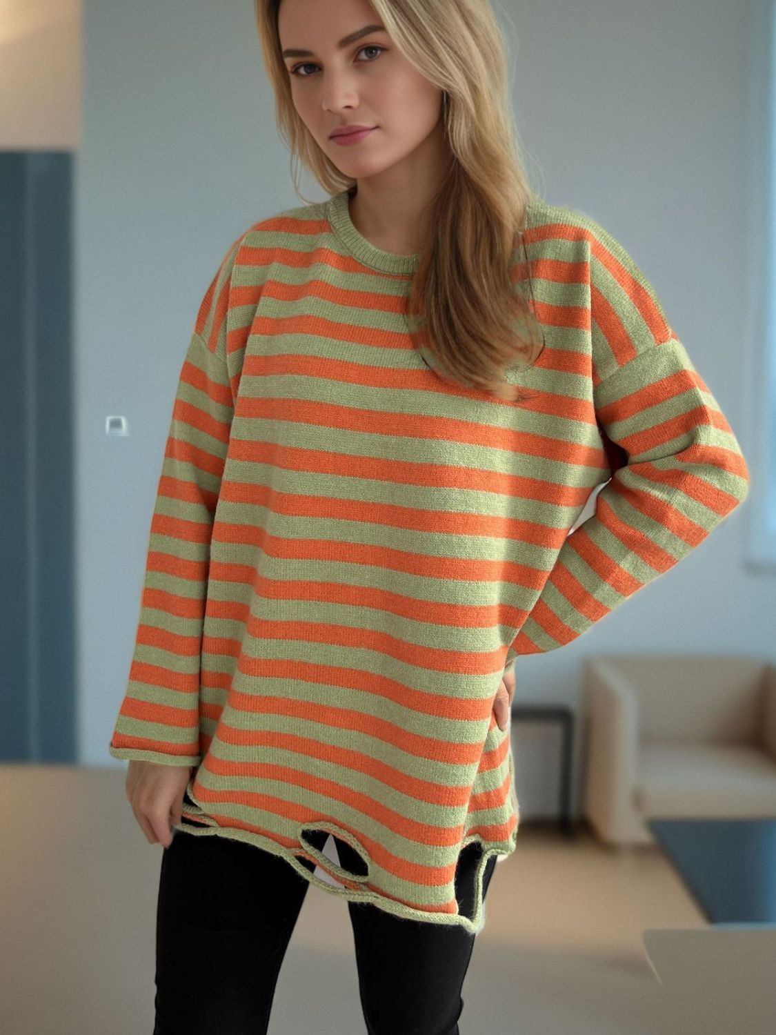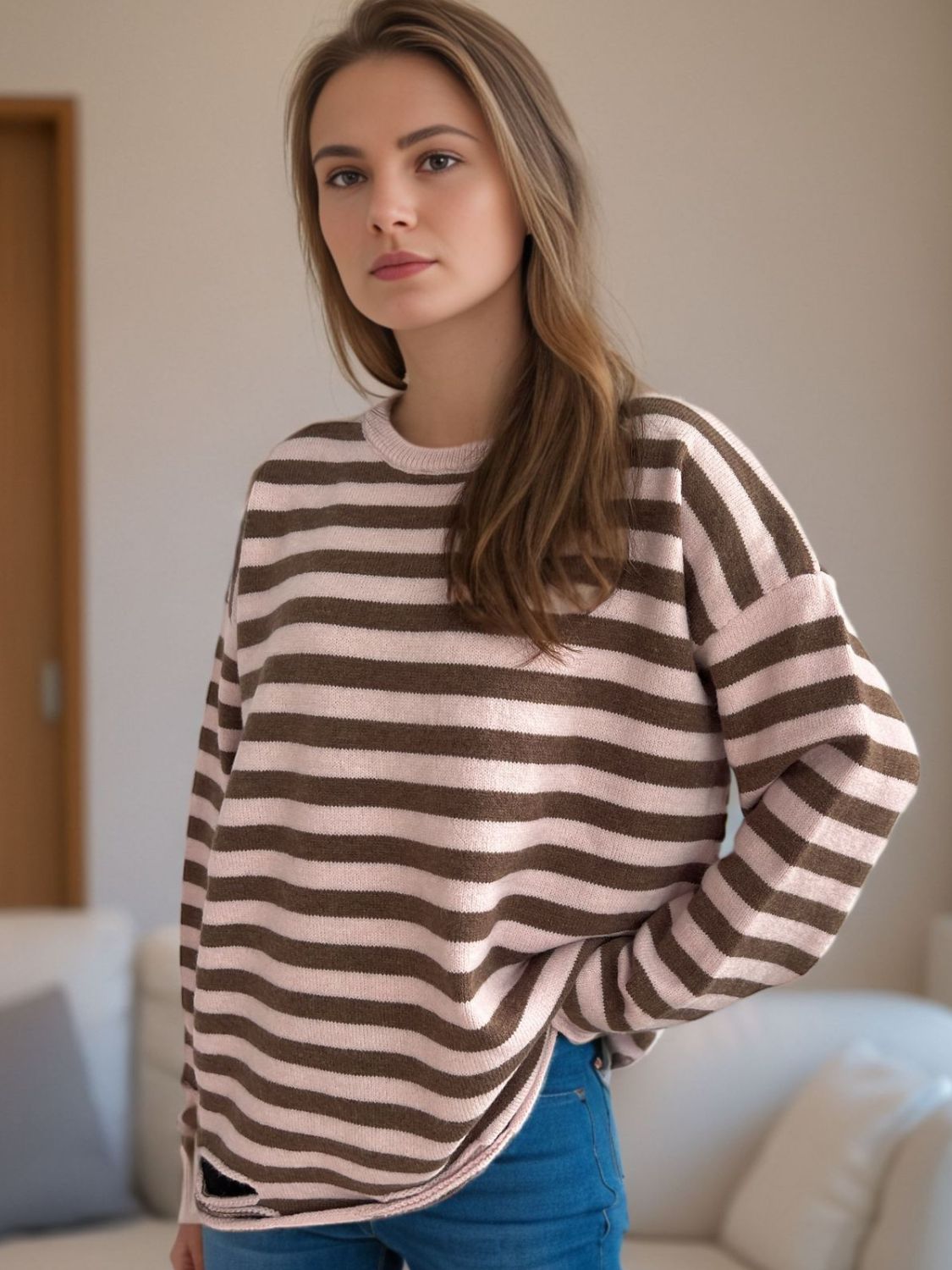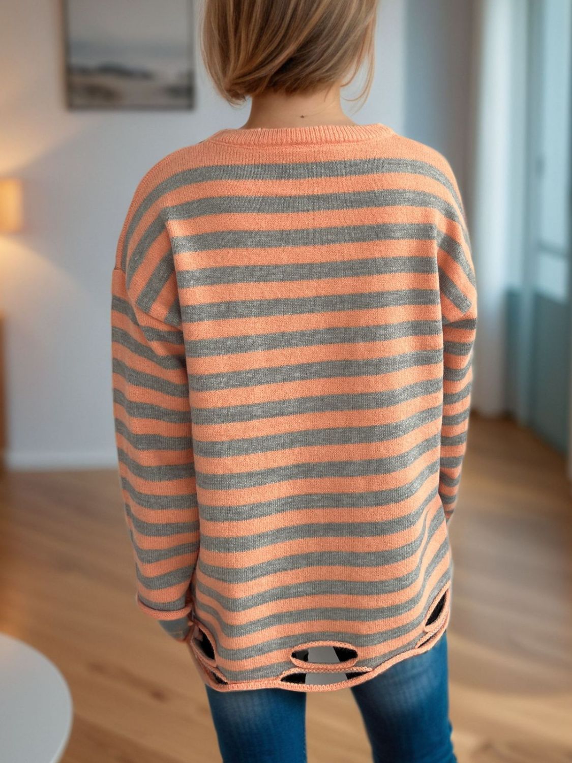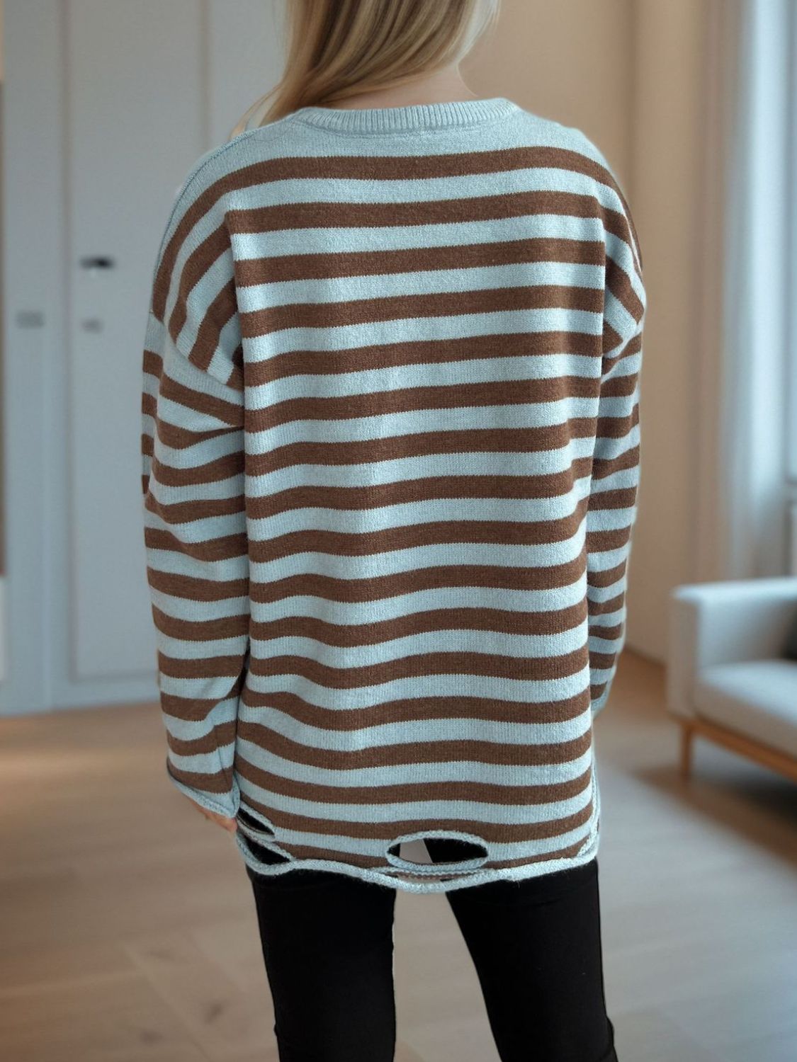 Distressed Striped Round Neck Long Sleeve Sweater
