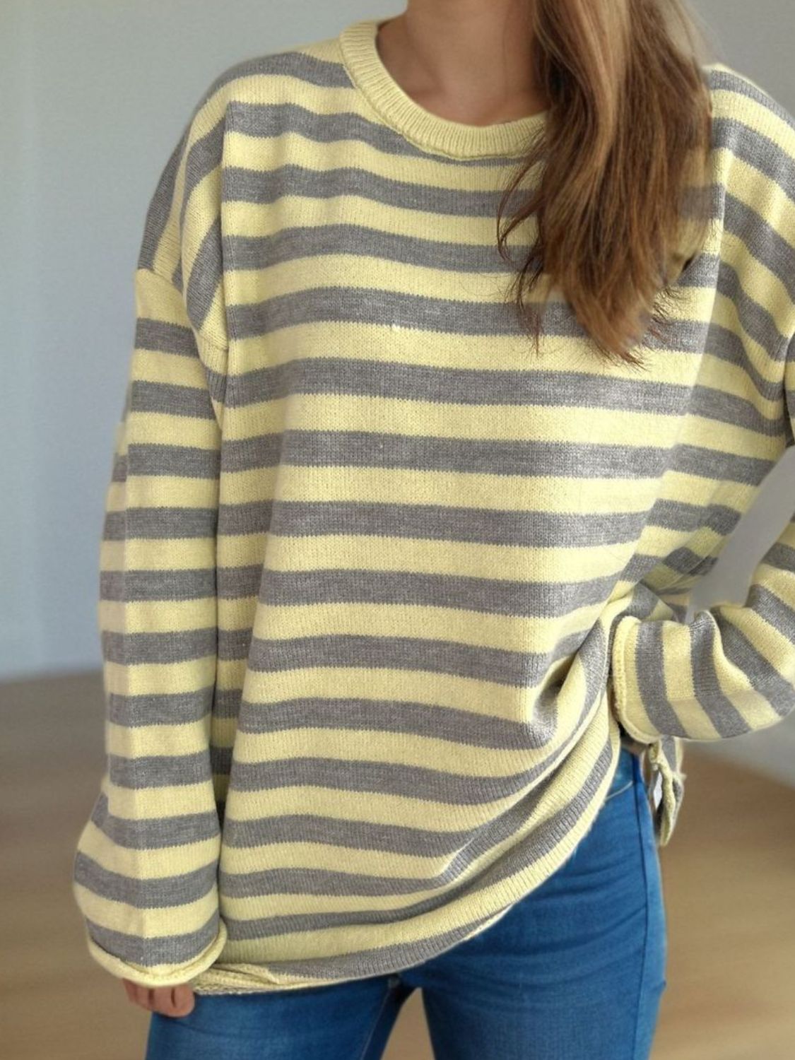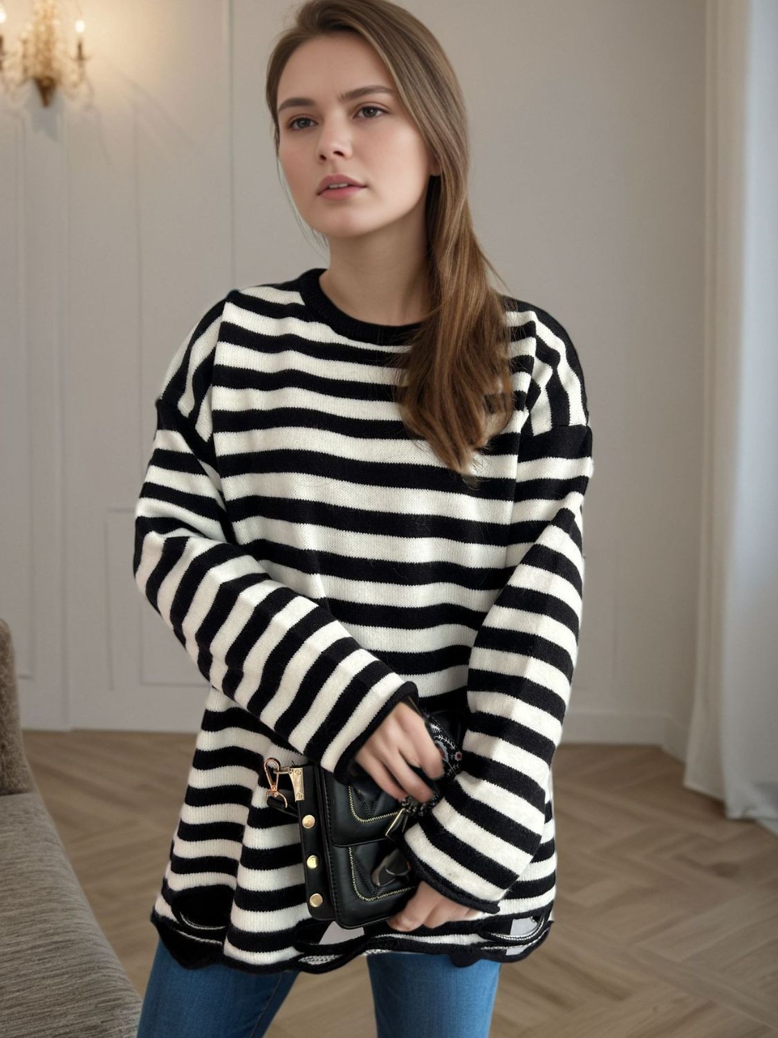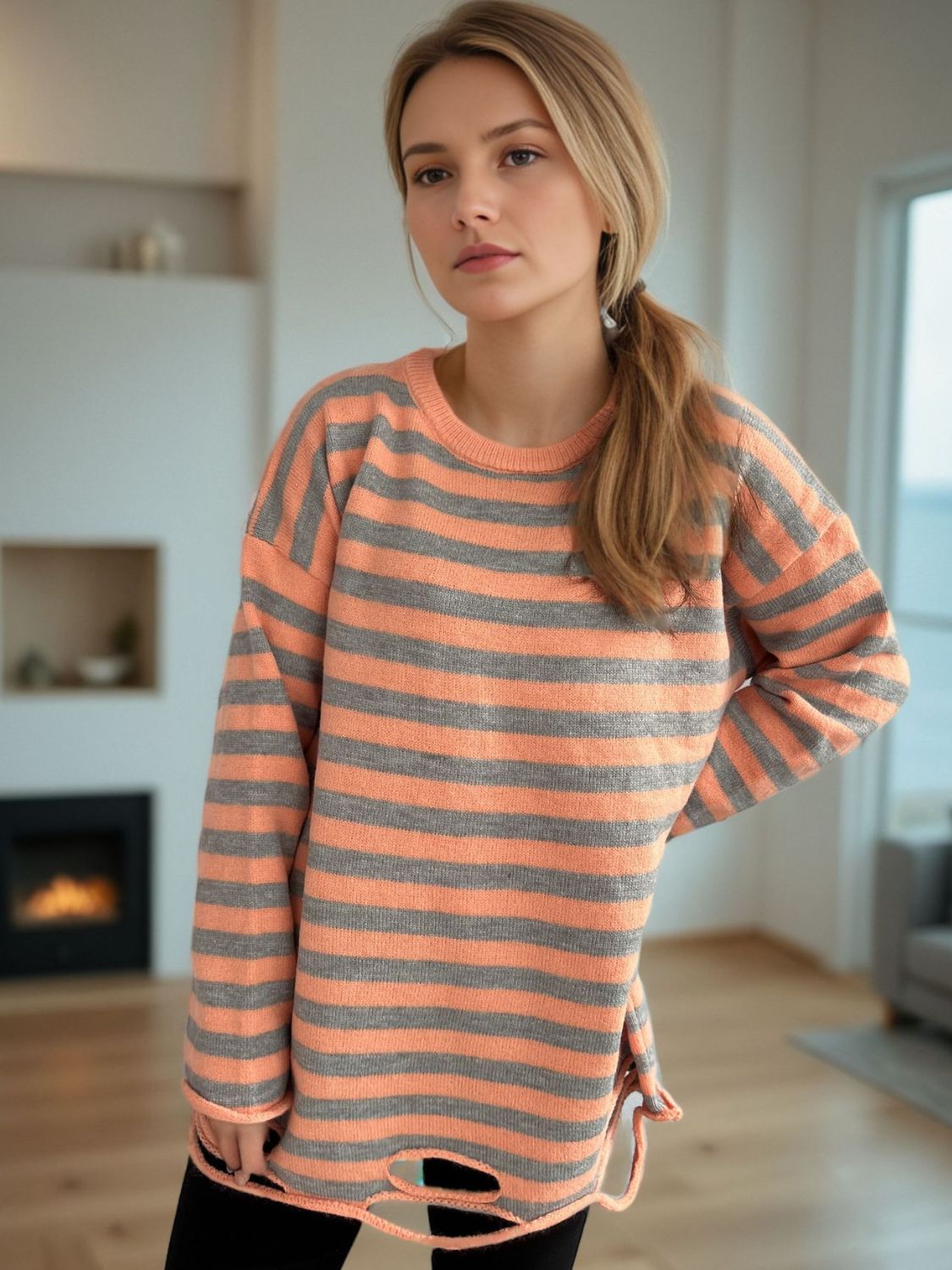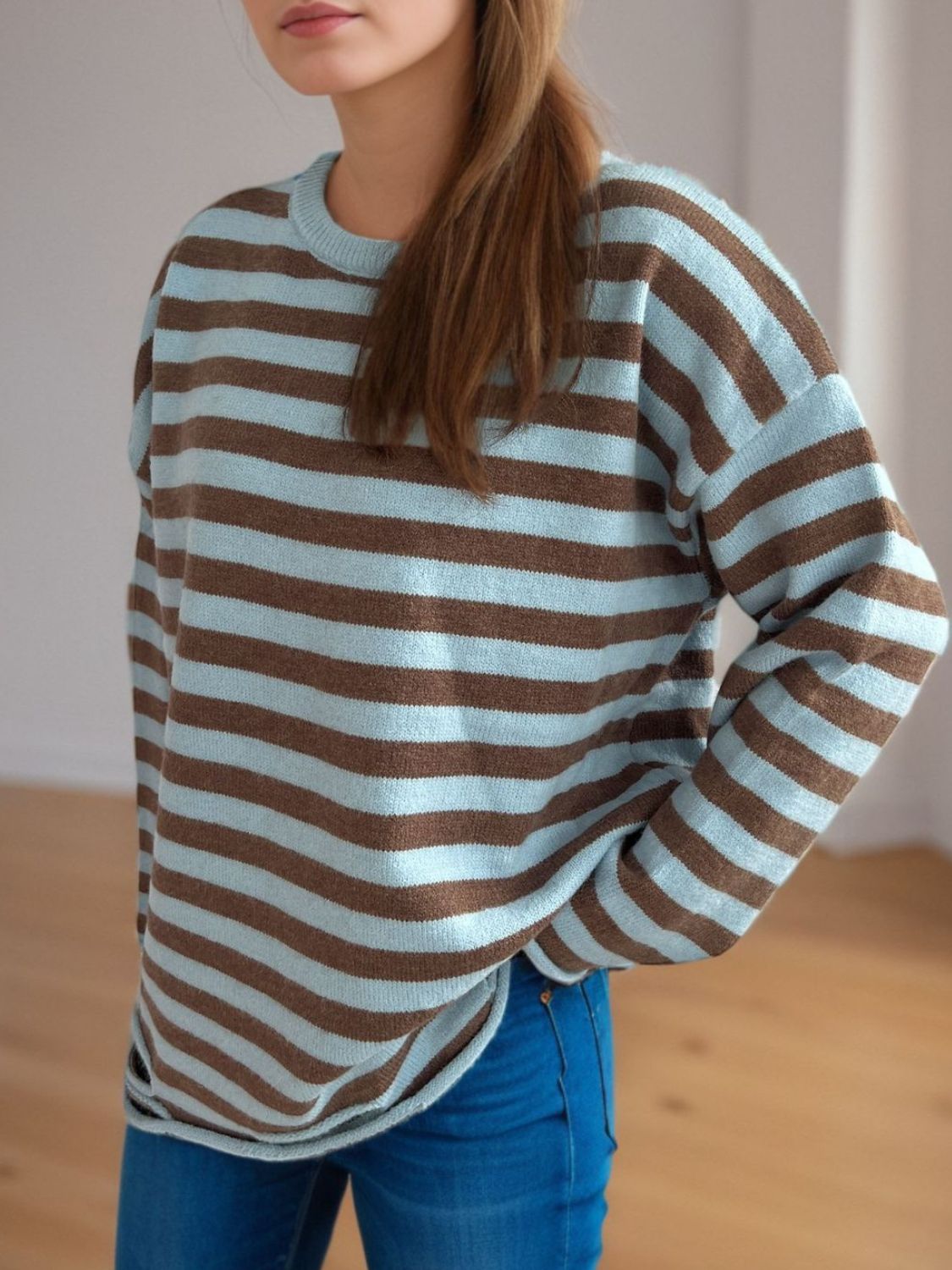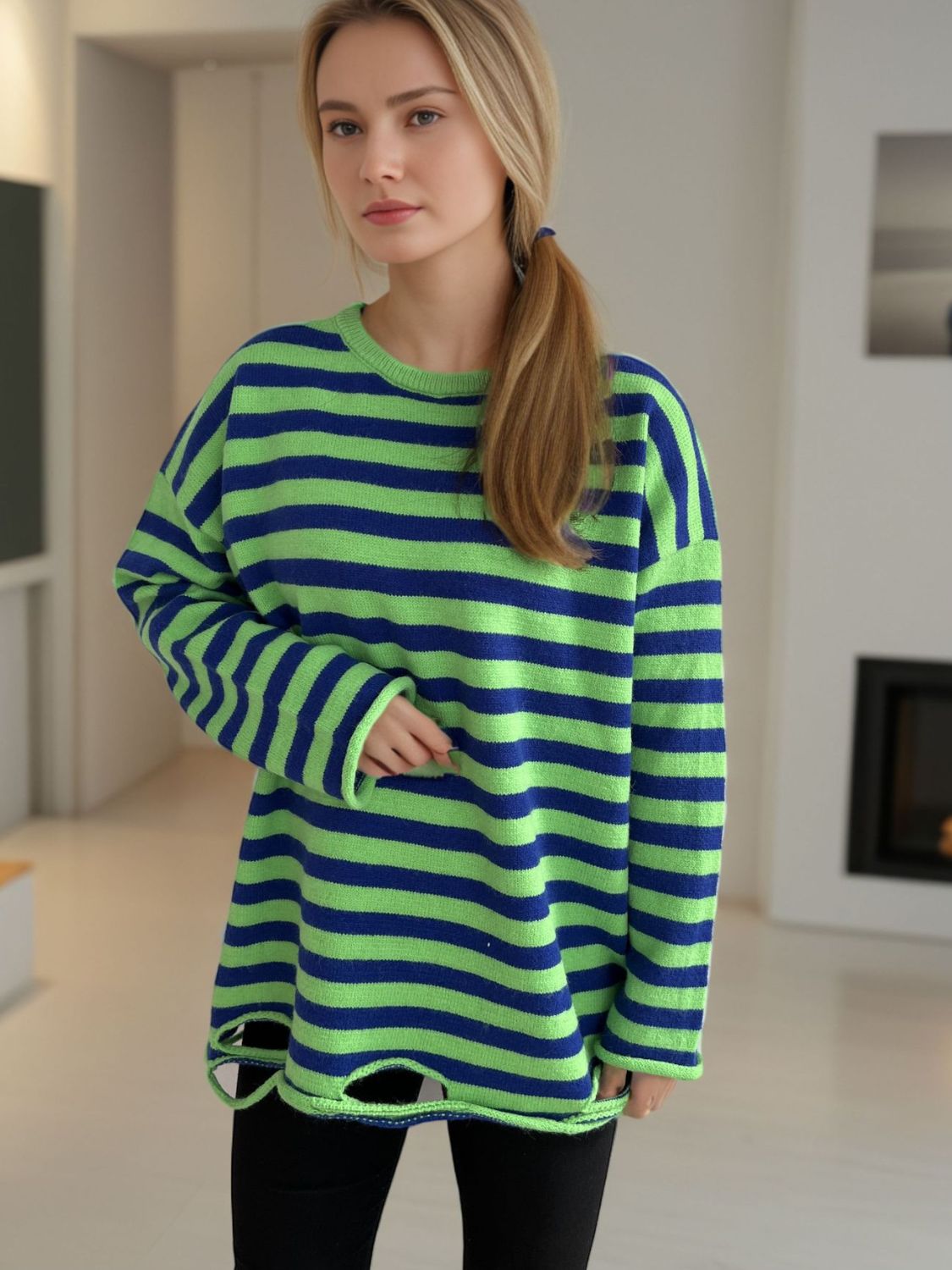 Distressed Striped Round Neck Long Sleeve Sweater