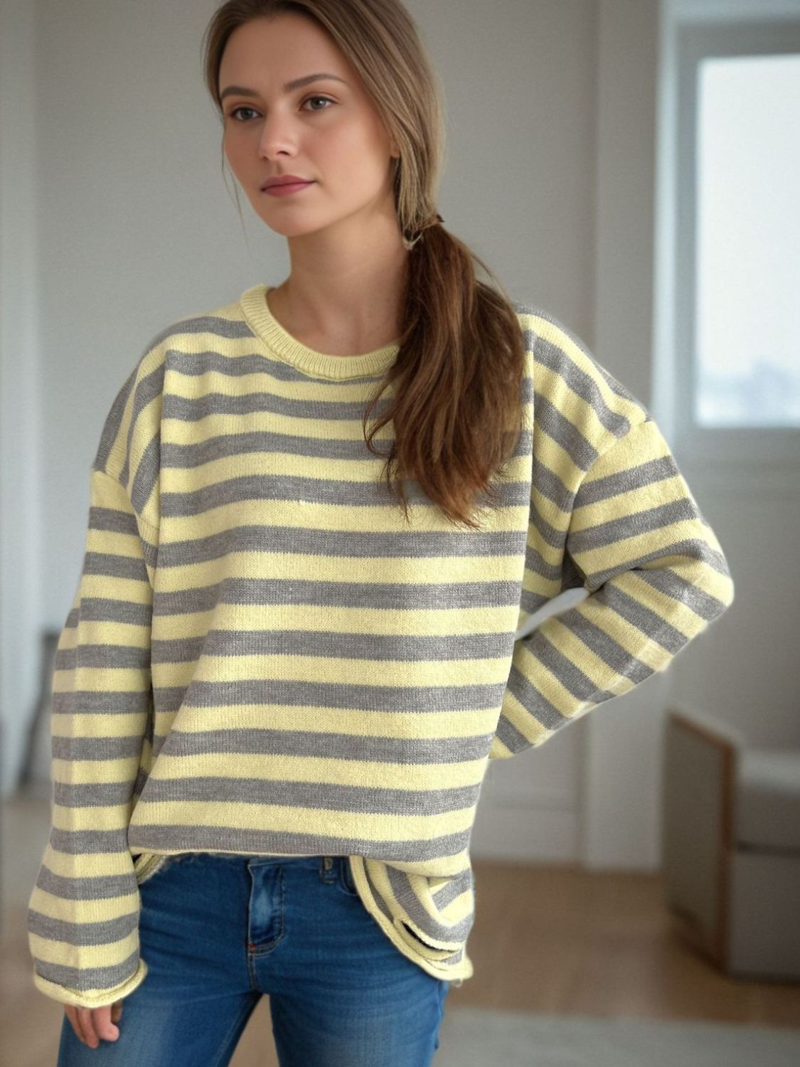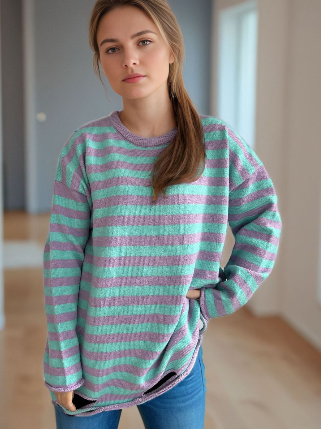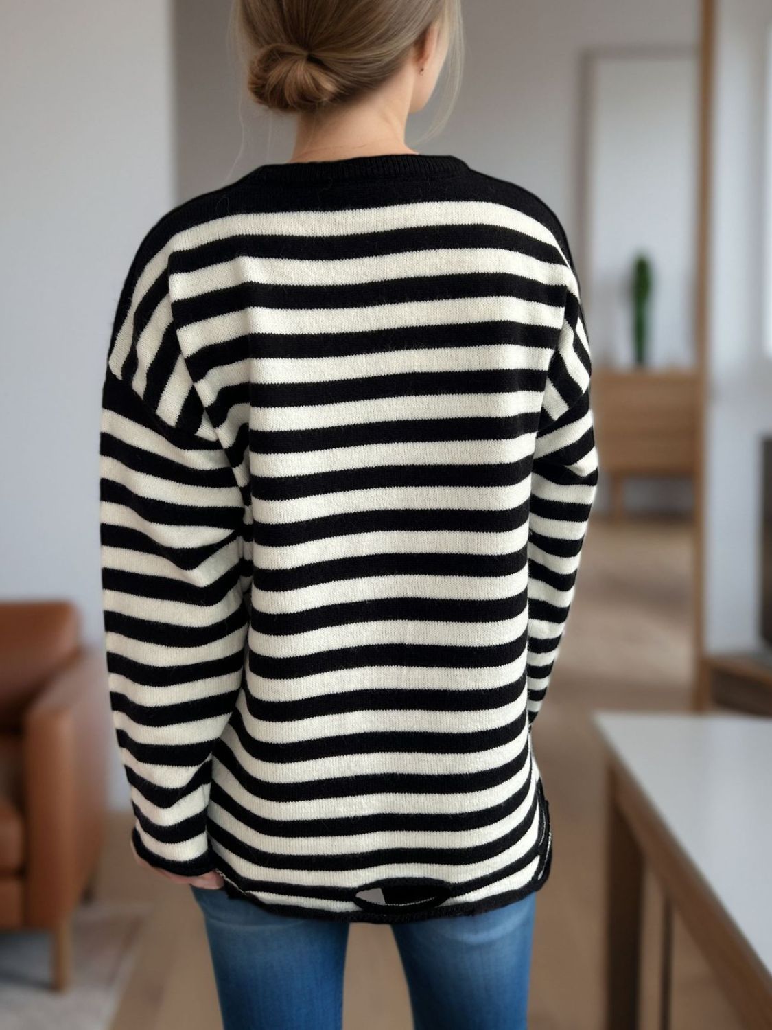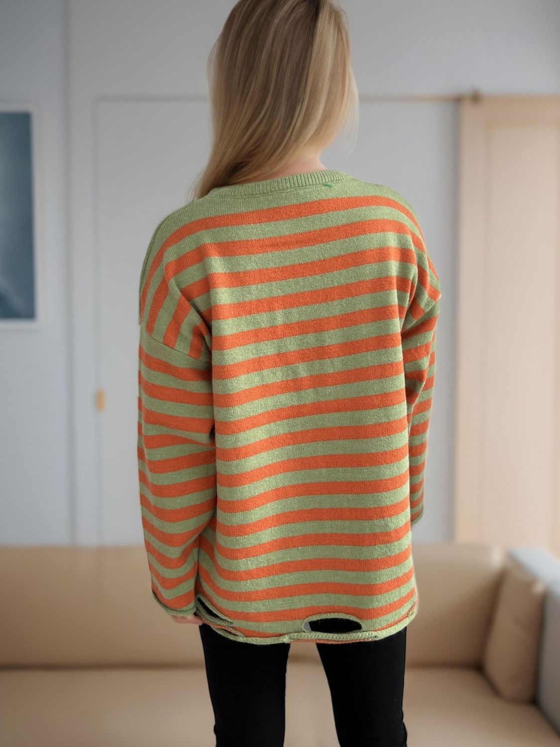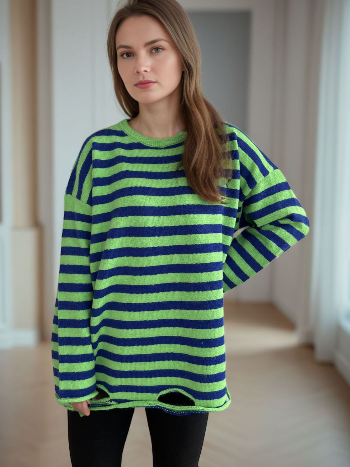 Distressed Striped Round Neck Long Sleeve Sweater