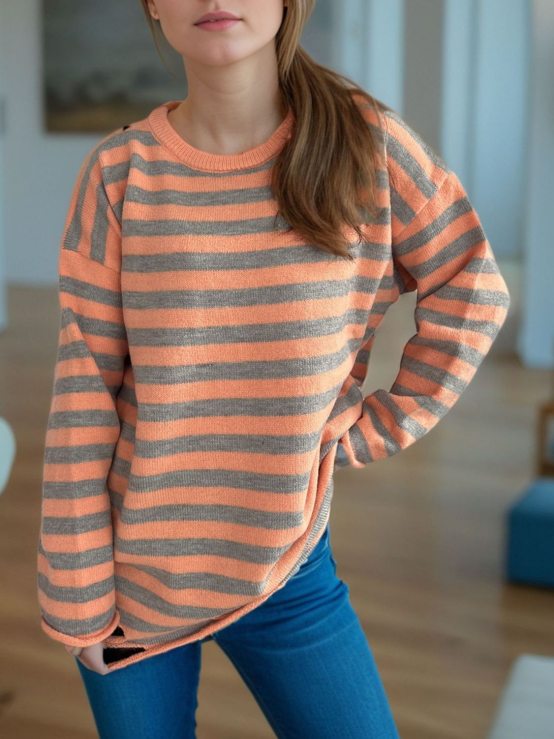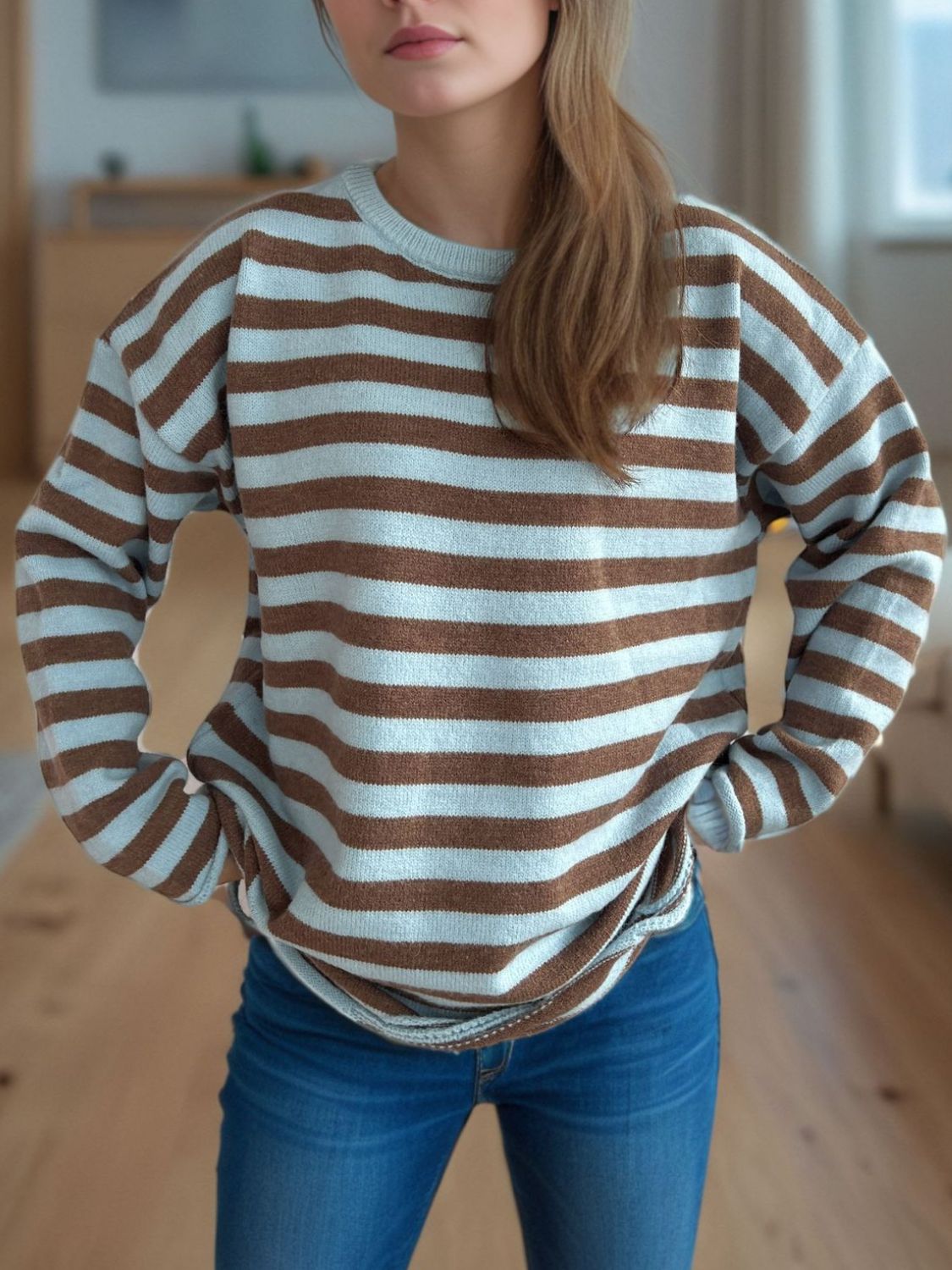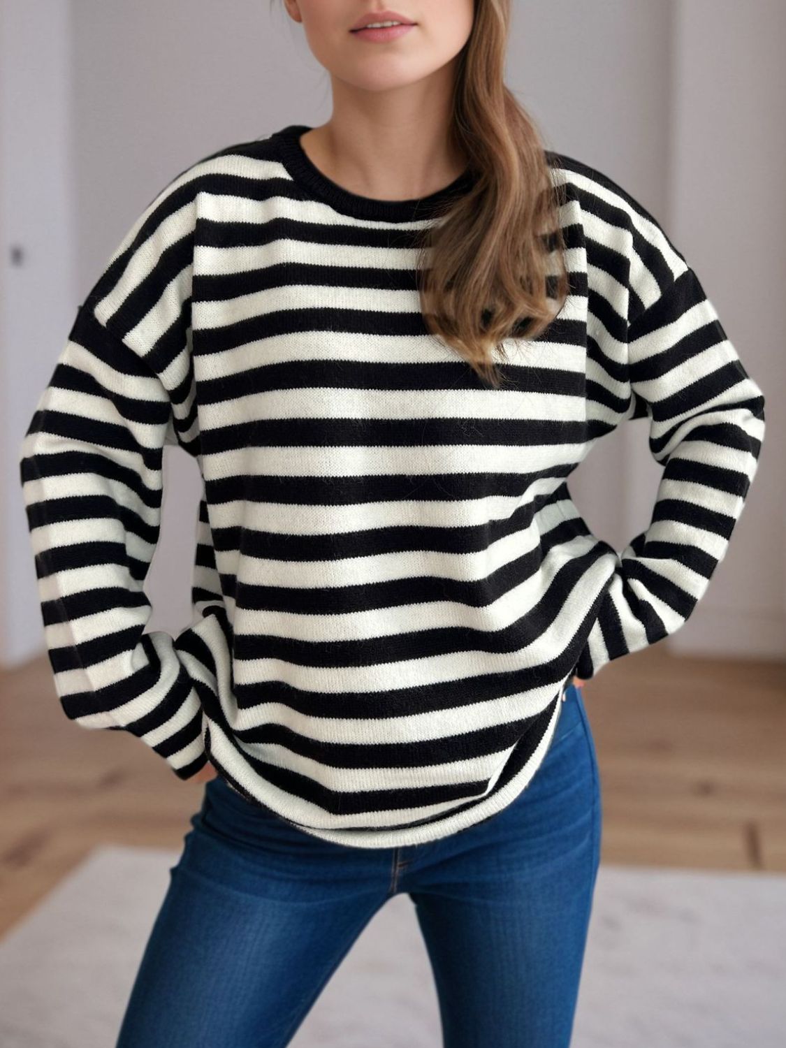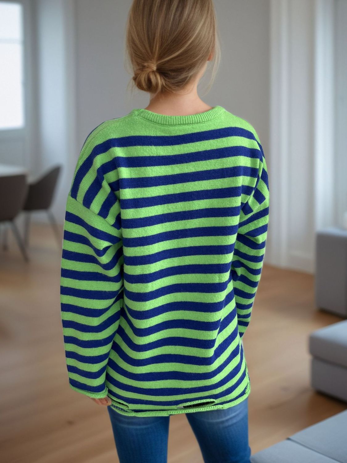 Distressed Striped Round Neck Long Sleeve Sweater