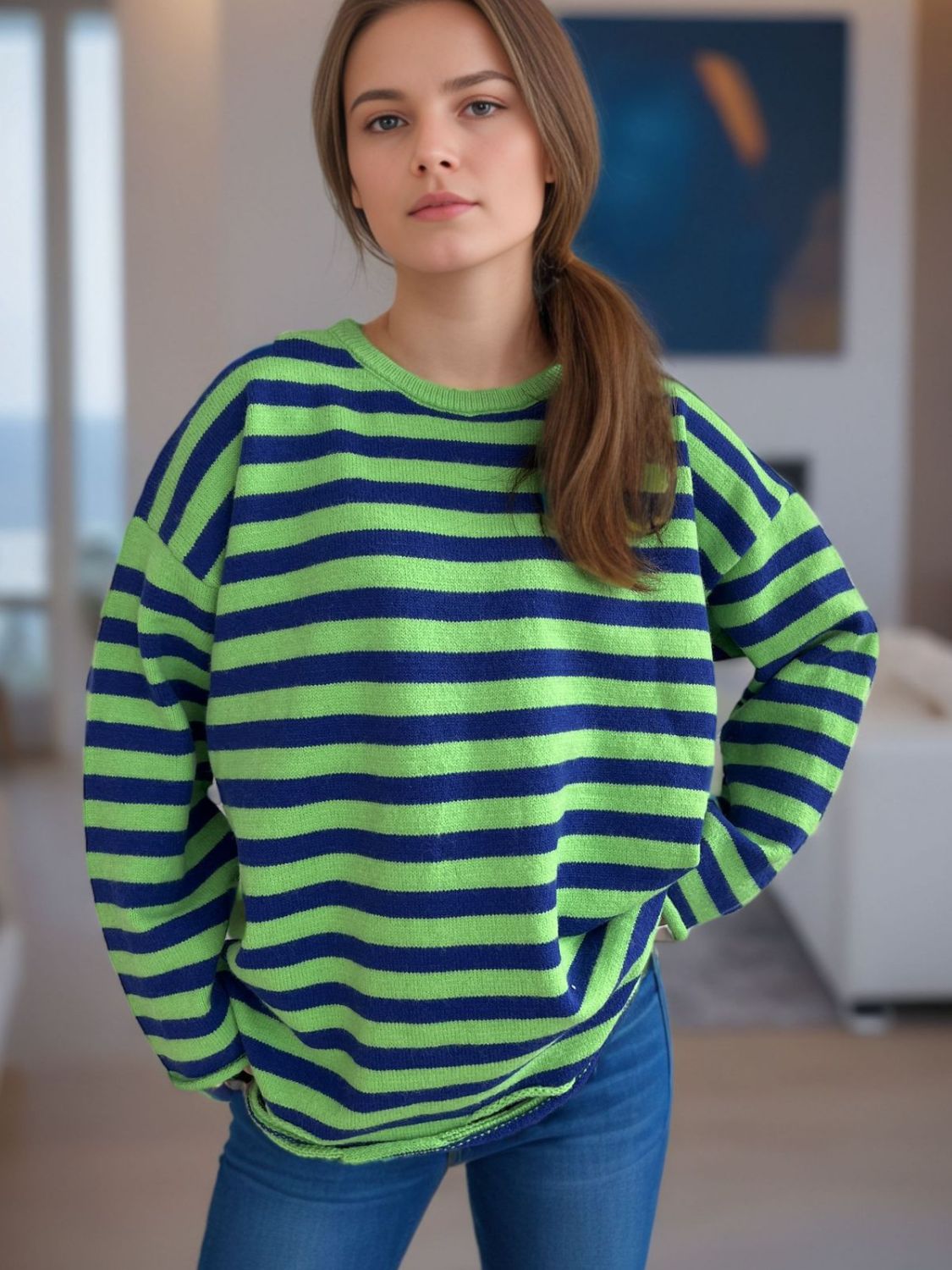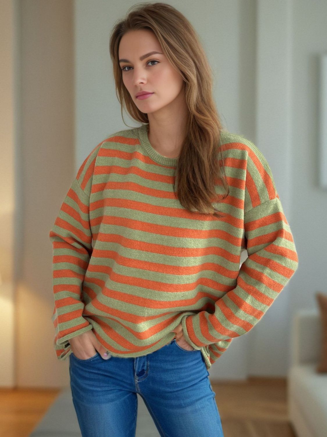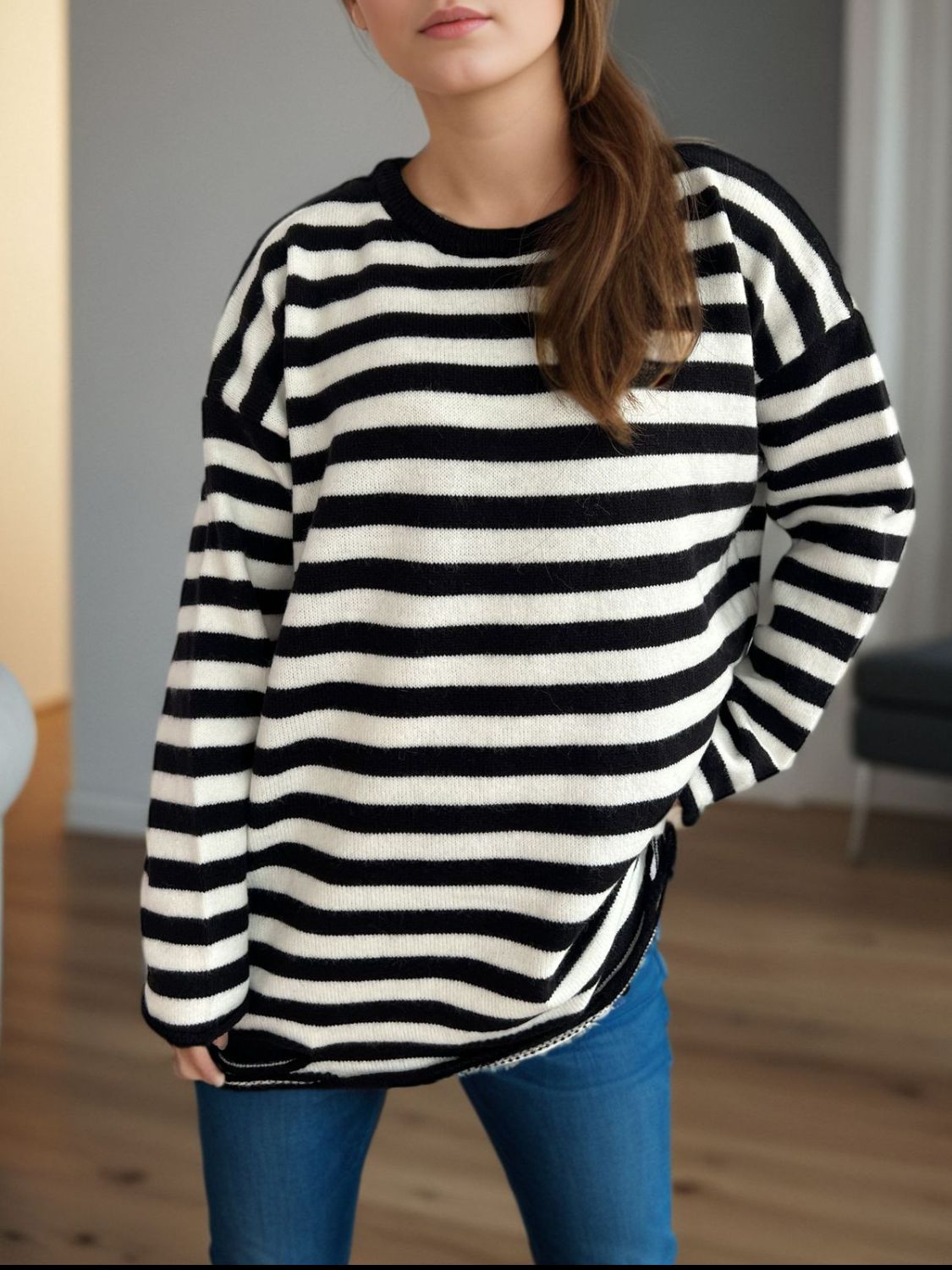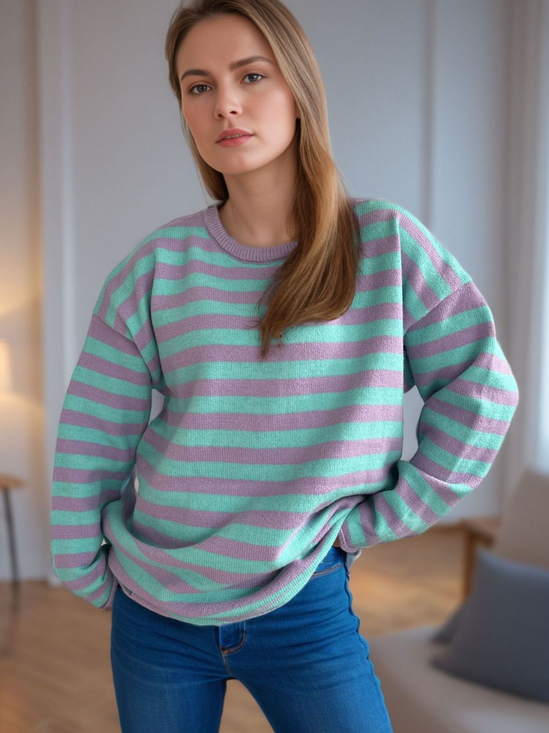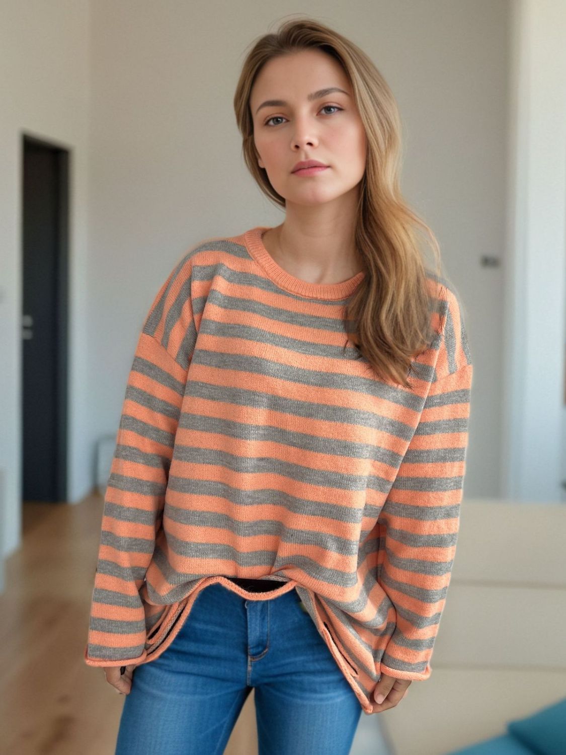 Distressed Striped Round Neck Long Sleeve Sweater
