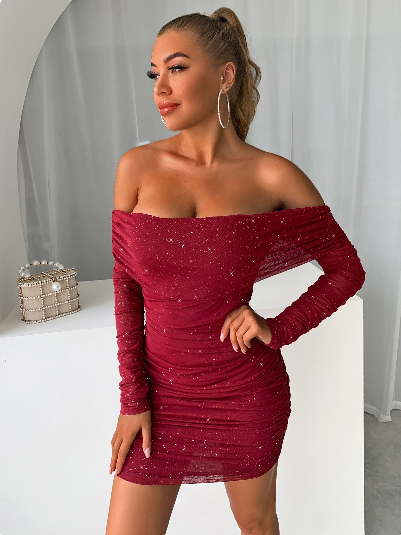 Glitter Mesh Off-Shoulder Ruched Mini Dress