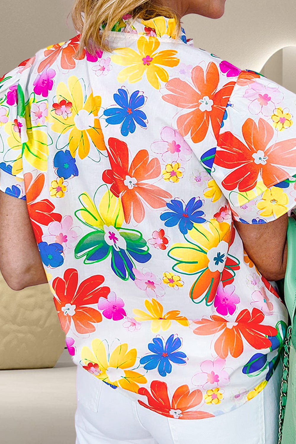Ruffled Printed Notched Cap Sleeve Blouse
