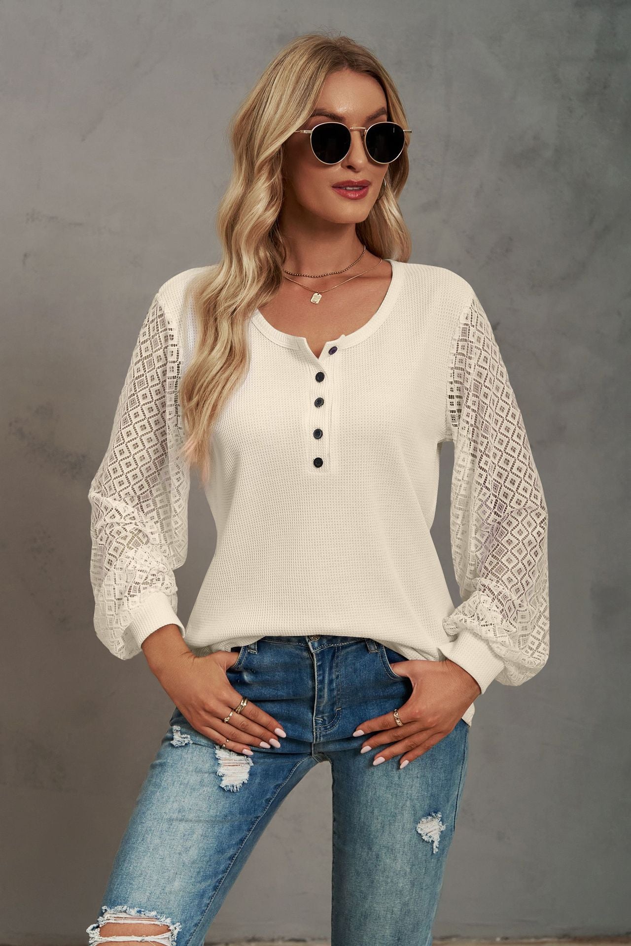 Waffle-Knit Lace Lantern Sleeve Henley Top